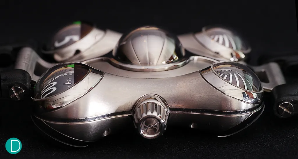 Al echar una mirada inicial al Space Pirate, uno percibe de inmediato que dista mucho de ser un reloj común. Para nada. Presenta cinco cúpulas; cada una curvada, ubicadas cual si fueran los apéndices o extremidades de una bestia metálica. Es más, algunos aseguran que se asemeja a un pulpo robótico, mientras que otros lo ven como una nave espacial de ciencia ficción lista para surcar el cosmos.